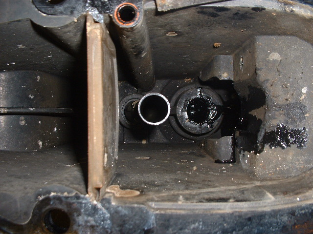 Så här ser överhuset ut underifrån sett. En gnutta fett på vattenröret (som är i koppar på äldre drev och plast på nyare) underlättar monteringen. Gör rent runt oljekanalen också.