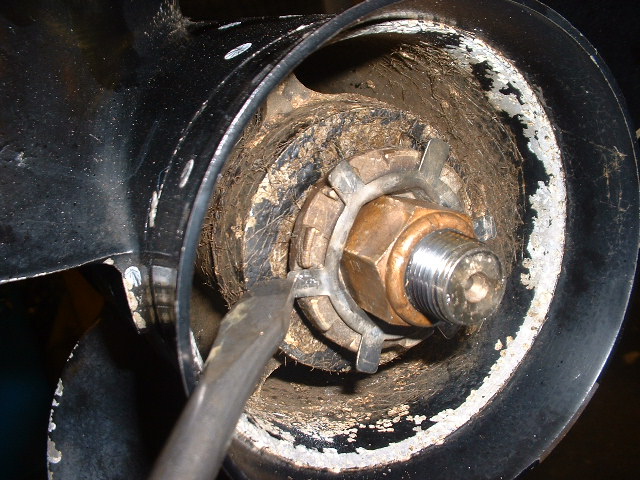 Här lyfter jag bort stålplattan och packningarna. Det är en packning på var sida om plattan. Lägg märke till det svarta som sitter runt axeln under uttaget för impellerkilen. Det är ett hus som innehåller två packboxar och är ett vanligt läckageställe på både gen I och II och jag kommer “tjöta” om vikten att provtrycka drevet längre fram i bildserien. På förekommen anledning faktiskt, för det läcker ofta någonstans. På just detta drev läckte det just här visade det sej, men det är en annan historia, Ser lite annorlunda ut på gen I. Där sitter packboxarna i undre delen av impellerhuset. I vår stora sats artnr 12120 (449:-) ingår allt med nya packboxar monterat och klart.